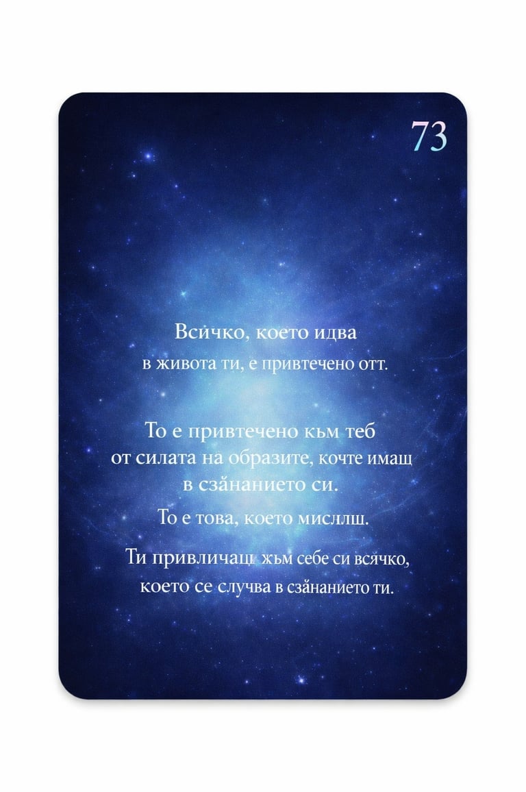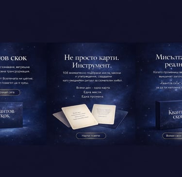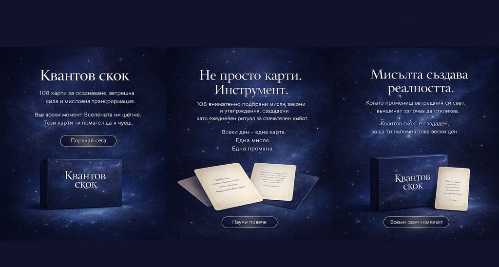 "Квантов скок“ е набор от 108 послания, които ти помагат да се свържеш със себе си, да промениш гледната си точка и да направиш малък, но истински квантов скок в съзнанието си.